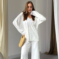 秋のルーズVネック長袖パンツパジャマセットホワイトニットカジュアルホームウェア